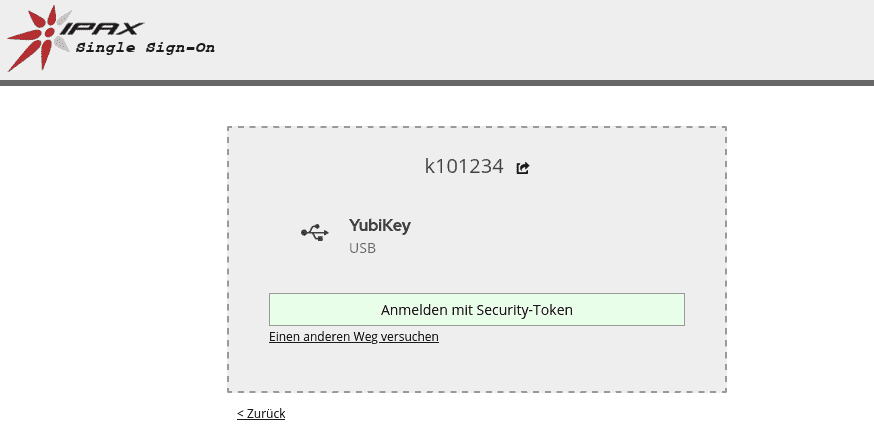 Um sich mit Ihrem konfigurierten WebAuthn Gerät anzumelden, klicken Sie auf „Anmeldung mit Security-Token“.